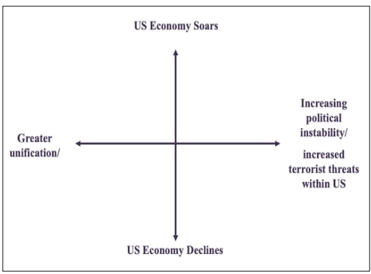 The next step involves considering how these drivers might interact. The charts below illustrate hypothetical examples of a scenario planning session. After you have identified the key forces that could impact the market, you map out pairs to examine the interplay between them. For example, in Chart 1 below, consider the impact of the combination of: